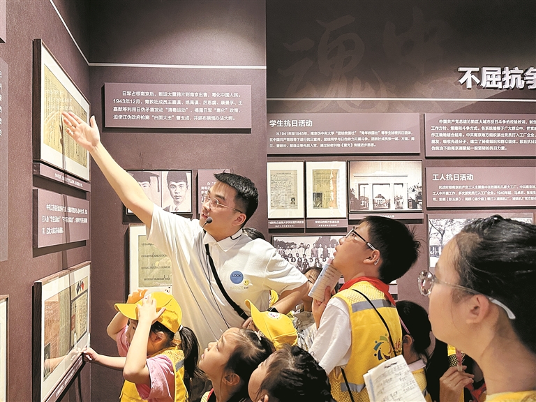 “担负起天下的兴亡——中国共产党领导下的南京人民抗日斗争档案文献展”在江苏省南京市档案馆展出。图为近日,志愿者在为参观的孩子们讲解。丛伟 摄